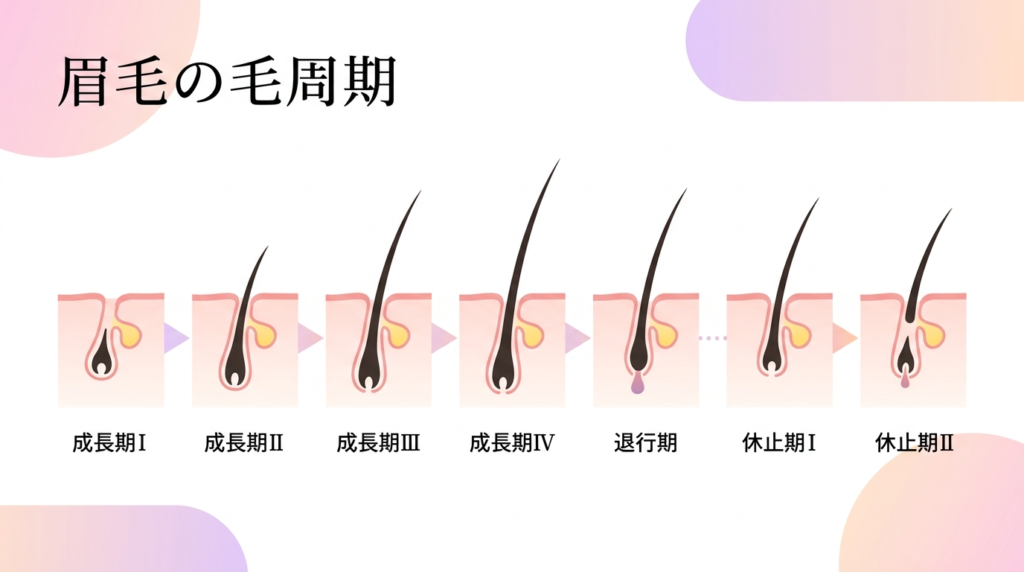 眉毛の毛周期は、一般的に約4〜8週間とされています。毛が生え始める「成長期」、成長が止まる「退行期」、自然に抜ける準備をする「休止期」という3つのフェーズを繰り返しています。腕や脚の毛に比べると周期が短く、それだけ毛の入れ替わりが早いのが眉毛の特徴です。