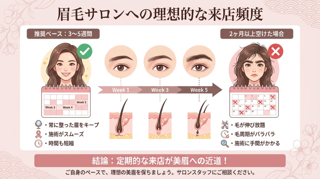 眉毛サロンに興味を持ち始めた方や、通い始めたばかりの方からよくいただく質問のひとつが、「どのくらいのペースで通えばいいですか?」というものです。毎月通うべきなのか、それとも気になったときだけでいいのか。正直なところ、よくわからないという方も多いのではないでしょうか。